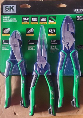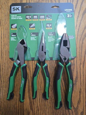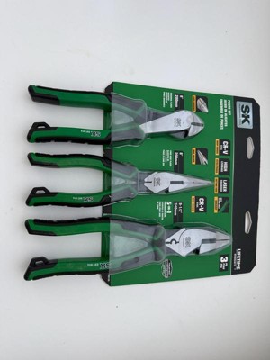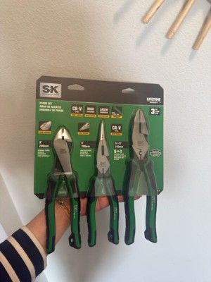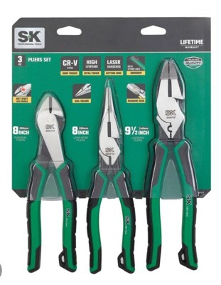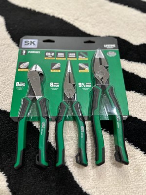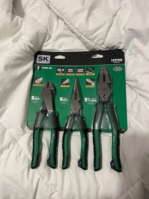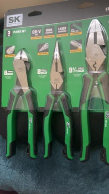 - MULTIPACK FOR VALUE: Our SK 3 Piece Pliers Set includes 9.5-Inch linesman pliers, 8-Inch diagonal pliers and 8-Inch needle nose pliers. Different sizes and styles of pliers are included to suit your individual projects.