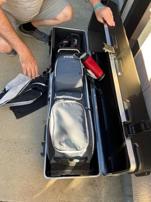 [This review was collected as part of a promotion.] Took forever to get here but I won’t hold that against the company. Overall opinion is this is a great travel golf case. Thick plastic walls, padded top portion provides protection for golf club heads/faces. Has a key you can use to lock the case. Wheels work perfectly and are rubber and not cheap plastic wheels. My golf bag (walking bag, on smaller side) fits perfectly and would imagine you might be able to squeeze some of the smaller cart bags in this thing. Highly recommend.