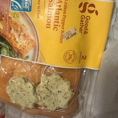 Cooking a restaurant-quality dinner for two is easy with this 2-Pack of Skin-On Atlantic Salmon with Lemon Pepper Butter from Good & Gather™. Skin-on Atlantic salmon is generously seasoned with lemon pepper butter for a standout dish that pairs well with rice, potatoes and veggies. The pack comes with two easy-to-cook portions, making it great for everything from date nights to quick and delicious weeknight meals.DirectionsSalmon needs to be fully cooked. Do not microwave. Skillet 1. Heat 1 Tbsp. oil in nonstick skillet over MEDIUM heat. 2. Cook 16 to 17 minutes, turning halfway through, until fish flakes easily with fork. Oven 1. Heat oven to 375°F. Spray baking pan with nonstick cooking spray. 2. Bake 17 minutes until fish flakes easily with fork. For food safety, cook to an internal temperature of 145°F as measured by a food thermometer. Appliances and fillet thickness may vary; adjust cooking times accordingly. Refrigerate or discard leftovers immediately.