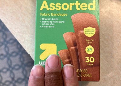 These 30-Count Brown Skin Tone Assorted Size Flexible Bandages from up&up™ cover minor scrapes and cuts without standing out against your skin. This pack includes 30 brown-tone fabric bandages in assorted sizes. The bandages provide stretchable, breathable protection to promote quick healing, and the four-sided seal helps them stay on for up to 24 hours.