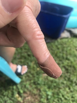 These Skin Tone Assorted Size Flexible Bandages - Brown are way darker in color then expected. My husband who has a darker tan couldn't camouflage these bandages. Not a deal breaker though since they do serve there purpose and there is a nice quantity per box and in different size to any size of cut or scrap you may need. These do stick well, all most too well when around the finger and they overlap. You almost have to cut it off. All around a good quality bandage to keep your wound clean.