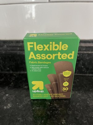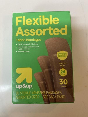 Keep minor scrapes and cuts covered with bandages that don't stand out against your skin with these 30-Count Dark Brown Skin Tone Assorted Size Flexible Bandages from up&up™. This pack includes 30 dark brown-tone fabric bandages in assorted sizes. The bandages provide stretchable, breathable protection to promote quick healing, and the four-sided seal helps them stay on for up to 24 hours.