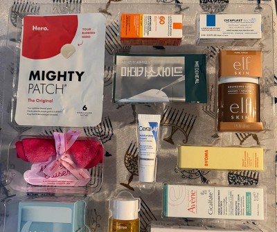 A: Hi Emalee - Thank you for reaching out to us with your query about the Skincare Advent Gift Set - 12pc. The Set includes E.l.f. Cosmetics Holy Hydration! Makeup Melting Cleansing Balm (Full Size) – 2 oz, E.l.f. Cosmetics Bronzing Drops in Pure Gold – 1 fl. oz, Hero Cosmetics Mighty Patch Original – 6 patches, Ma:nyo Pure Cleansing Oil – 0.84 fl. oz, La Roche-Posay Anthelios Sunscreen SPF 60 – 0.17 fl. oz, Mediheal Madecassoside Blemish Pad – 2x, CeraVe Moisturizing Face & Body Cream – 0.17 oz, Avène Cicalfate+ Restorative Protective Cream – 0.5 fl. oz, La Roche-Posay Cicaplast Balm B5 Soothing Therapeutic Cream – 0.1 fl. oz, BYOMA Creamy Jelly Cleanser – 0.33 fl. oz, PanOxyl Acne Foaming Wash 10% Benzoyl Peroxide – 1 oz, MakeUp Eraser The Original MakeUp Eraser Daily (Full Size). I hope this information was helpful. Happy Shopping! - Josh