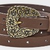 Add a charming finish touch to your outfits with this Skinny Floral Buckle Belt from Universal Thread™. Made from polyurethane, this skinny belt comes with multiple holes for a customized fit. The floral detailing on the buckle gives this belt a subtle touch of style and texture, making it perfect for pairing with a variety of casual or dressier outfits.
