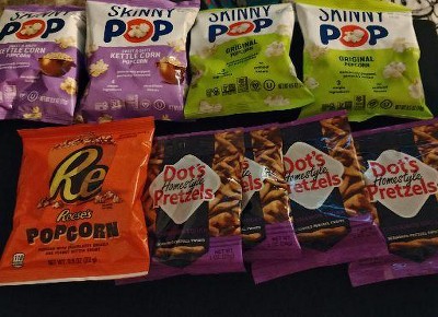 reese's popcorn - sugar, popcorn, vegetable oil (soybean oil and/or sunflower oil, palm kernel oil), hydrogenated vegetable oil (palm kernel oil, soybean oil), partially defatted peanuts, contains 2% or less of: corn syrup solids, whey (milk), cocoa, salt, skim milk, lecithin (soy), natural & artificial flavors., dot's cinnamon sugar - enriched wheat flour (wheat flour, niacin, reduced iron, thiamin mononitrate, riboflavin, folic acid), vegetable oil (canola oil, corn oil, &/or soybean oil), sugar, brown sugar, honey, contains 2% or less of: salt, butter (cream, salt), cinnamon, skim milk, maltodextrin, natural flavor, vanilla extract, maple syrup, molasses, yeast., skinnypop sweet & salty kettle corn popcorn - popcorn, sugar, sunflower oil, sea salt., skinnypop original popcorn - popcorn, sunflower oil, salt.