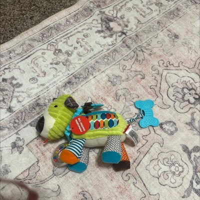 - Multi-sensory play features include rattle, crinkle, teether toy, mirror, squeaker & more