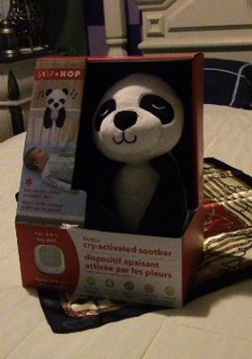 [This review was collected as part of a promotion.] I was really impressed by the good quality and sound of the Skip Hop - Cry-Activated Soother - Panda because it actually lets me record my own voice so that my baby can hear it when she cries. The Panda Soother has its own lullabies and other soothing sounds but I liked that I could record my own little song for my baby. You can setup the Panda sound module so that when the baby cries it can automatically play to sooth your baby, and the volume on the module is not too loud. Now I did have a problem insert the module into the back of the Panda pouch, so I was able to hang the panda on the edge of the crib, but I did place it near the baby, far enough to were she wouldn't be able to grab it yet. Over all this is a very nice Cry-Activated Panda soother!