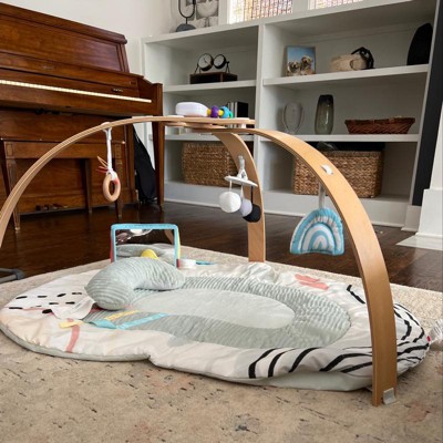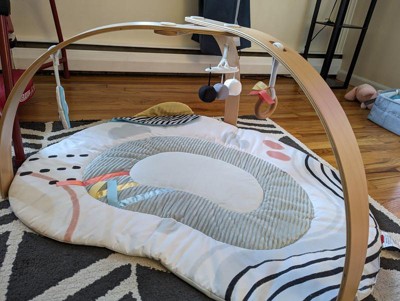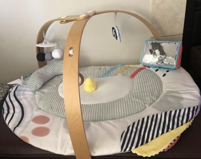 [This review was collected as part of a promotion.] The Skip Hop Montessori inspired play gym has a variety of features that keep my baby interested and engaged. The mat itself has different textures along with a few materials like crinkling flaps and ribbons; the colors are beautiful. The wooden arch has a smooth finish and was easy to put together. There are three toys that dangle from the arch and my baby loves batting them while lying on her back. During tummy time, the mirror is such a fun way for baby to keep her head up and concentrate. The mat is easy to wipe and spot clean when spit-ups eventually happen.