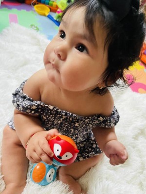 I hate these things. They are round and awkward, and my baby cannot hold them in her tiny hand. There is just nothing small for an infant to grab. She ends up frustrated because they slide out of her grip. Although they are cute, there are better rattles available.