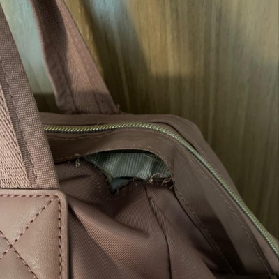 So the bag is fine. It does the job, I feel like I can fit enough in it (have used it multiple times as my sole carry-on when flying with babe). The biggest problem with this bag is you have to use 2 hands to zip it up. If you are at a public charging table and one hand is holding baby, it’s nearly impossible to open the bag or close it!!