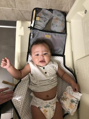 [This review was collected as part of a promotion.] BABY LOVERS!! I purchased this and I am beyond happy with it! It even matches with my all in one diaper bag from Carter’s!!! I love the fact that I can take this is in my grocery trip with my son and change him in the restroom with ease and everything right in front of me!!! Some changing tables have hooks above and I can unzip the top part to hang to get what I need to change his diaper. The fact I can snap it to my purse and or the stroller makes it so easy to not have to take the whole diaper bag with me. Thanks for the simple to carry, easy to clean off portable changing pad and assorted holder options. This is a go to get product! I even have space that I put extra clothes just in case my baby needs a change ! It’s not to bulky or to small!