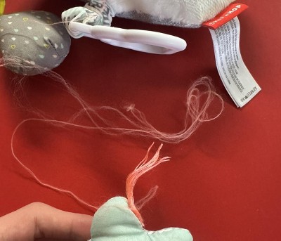 My baby has had this toy for about 4 months. It’s fairly weak apparently. I would have expected it to be a bit stronger. She ripped the star off and that’s when I noticed the other dangling ribbon is about to be ripped off too.