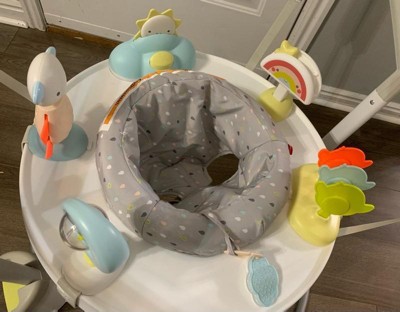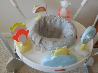 [This review was collected as part of a promotion.] The Silver Lining Cloud™ Play & Fold Jumper by Skip Hop is a game-changer for playtime with your little one. Packed with over 20 developmental activities, this jumper provides endless entertainment for babies as young as 4 months. The 360-degree rotating seat allows your baby to explore every corner while sitting, swiveling, and bouncing. One of the standout features is the peekaboo sun, which rewards your baby with colorful lights and delightful music, making playtime even more engaging. The clip-on toys, including the movable rainbow, moon spinner rattle, bird clacker, and jumping jack lamb, encourage development and can be customized for your baby's play preferences. As your baby grows, you can easily adjust the jumper's height, ensuring it remains a favorite playmate. And when playtime is over, it conveniently folds flat for storage or travel, making it a parent's dream. The Silver Lining Cloud™ Play & Fold Jumper is a fantastic addition to your baby's playroom, offering endless fun and development in one. Plus, its easy-to-clean design ensures that it's practical for parents too. Don't forget to grab some AAA batteries to keep the fun going!
