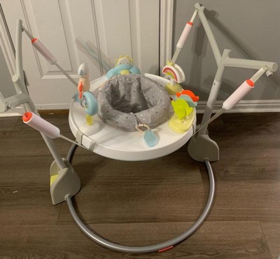 [This review was collected as part of a promotion.] Our daughter loves this jumper, there's so much to keep her busy. Not only can she jump and play for exercise, there are several toys to help with development. It was put together in less than 10 minutes. And it folds flat so we can just slide it under the couch!
