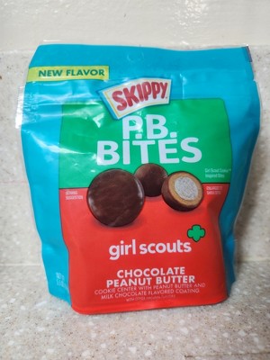 - SKIPPY PB Bites Girl Scout Chocolate Peanut Butter has a vanilla cookie center, rolled in SKIPPY Peanut Butter coating, rolled in milk chocolatey coating for an impressive snack for impressive #adulting