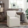 MATERIAL Frame Composition: Soild wood and plywood Leg Material: Plastic wheels Arm Material: Solid wood Fabrication Composition: 100% polyester, woven Filling: Form PRODUCT DETAILS See below 1 Dining Chair: 24.5"W x 24"D x 34"H Seat Dimension: 20.25"W x 17.75"D x 20"H Seat Cushion Thickness: 20" Arms Size: 20.25"W x 24.5"H Back Rest Size: 20.5"W x 14"H Maximum Weight Capacity: 300 lbs