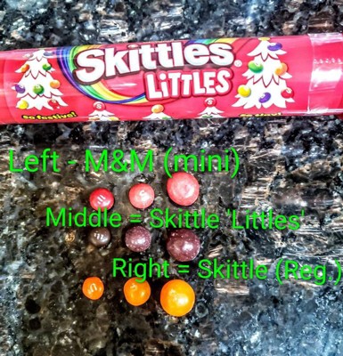 [This review was collected as part of a promotion.] Okay, so don't get me wrong here...they are smaller than regular Skittles. But when I took them out of the tube, I expected them to be MUCH smaller (closer to Mini M&M size). I had to go get a bag of Skittles from my kids Halloween candy, because as soon as I dumped them out of the tube, I thought "Little" maybe meant the container size, and not the size of the Skittle itself. If wasn't until I put them side by side, from left to right in photo: Left - M&M mini Middle - Skittles LITTLES (review) Right - Skittles (Regular) As you can see they are smaller than the regular Skittles, but until you side by side them they don't look much smaller from a a regular Skittle! They actually did taste a little less flavorful, but they had a bit more "chew" to them, which I enjoyed. My 7 year old not so much (because she couldn't eat as many we fast maybe?) To be honest, I'm not entirely certain what the point of this tiny size candy is for? Yes it's nice to have it for decorative purposes, but as a mom of young ones, I look at it more as a potential choking hazard. Just kind of feels unnecessary as there isn't anything different than a slight smaller size. Sorry Skittles. You may have missed the mark here!