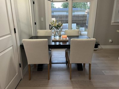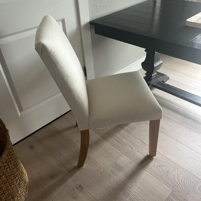 I purchased four of these chairs in the talc linen color with natural legs for our dining table, and I couldn’t be happier. The fabric is absolutely beautiful - a creamy neutral white with subtle linen speckling that adds lovely texture. They look and feel high-end. I paired them with two Skyline Furniture slipcovered chairs in Zuma White (also from this line, sold at Target) for the ends of the table. The pairing is stunning. The colors are in the same family - Zuma White which leans more ivory—and the dimensions match perfectly, creating a cohesive, designer look. Assembly was quick, my husband had all six chairs together in about 10 minutes. Only one gave a little trouble with alignment, but he was able to fix it easily. These chairs are solid, have a nice weight to them, and are genuinely comfortable, something that was extremely important to me. I spent weeks visiting stores and testing out chairs that cost hundreds more, and none of them were as comfortable as these. I was torn between these and a $650 chair at Arhaus, but in the end, I’m so glad I chose these. I saved a ton of money and still achieved a timeless, elegant look.