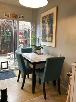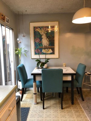 Wasn’t sure the height if these chairs would work. But I am very happy. The turquoise linen is very nice. The chairs are comfortable and I’m happy