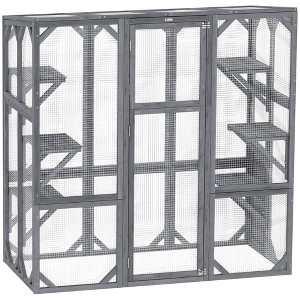 Discover the joys of the great outdoors safely with the catio outdoor cat enclosure! The back panel can be DIY, connects to different spaces, and even has a small door hole for added adventure. Its sun panel and titled roof ensure your furry friends stay cool and comfy. Suitable for up to three cats to explore the six jumping platforms in this spacious cat patio.Features: