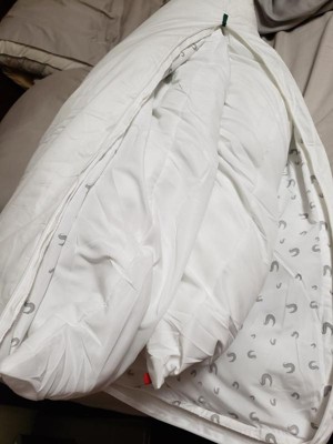 [This review was collected as part of a promotion.] This is a very unique pillow -- three parts. It is king size. It has the look and feel of a comforter made into a pillow. Inside the protective pillow pouch (which looks like a comforter and can be washed) are two more pillows. One is red tagged and one is blue tagged. Upon receipt, you will have to fluff them in the dryer on low for 10 minutes and then let them sit out for 24 hours. Putting them back into the original case was very easy.You don't have to add both insets since one is fluffier than the other. It makes for a very firm pillow on the bed that does not move around, yet soft for your head. If you are like me and find yourself scrunched up hugging your comforter and using it as a pillow, you are going to love this -- it is exactly like that, but in pillow form. Had excellent sleep with this as my pillow.