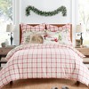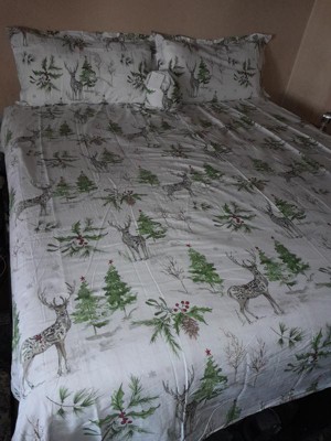 [This review was collected as part of a promotion.] A festive winter holiday quilt cover set in King size. It can be used by itself as a layering piece or as a Bedspread. This is reversible. One side is a nice cozy scene with deer,trees and Holly. The other side is a red and white plaid. So super soft cotton front with a microfiber back. The bottom edge is lined with clear buttons to use this as a quilt cover. And comes with 2 generous size pillow shams. Very exquisite ensemble. Cheerful and goes well with my Christmas decor. It comes prewashed for your convenience. Machine washable.