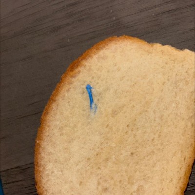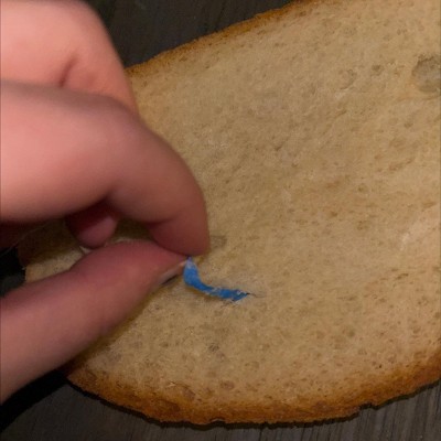 Looks to be a piece of a glove inside the bread. We had already eaten a few slices when we found the blue latex material.