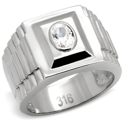 A large 11.9mm clear CZ dominates the center of this polished stainless steel ring, set within an intricately inscribed design that adds depth and style. The polished finish catches light from every angle without plating, giving it a sleek, modern shine. Weighing 13.2 grams, it feels substantial on the finger while remaining comfortable for daily wear. Designed for men who want a bold, eye-catching accessory, it works perfectly for casual outfits, office wear, or evening events. Wear it alone to showcase the central stone or pair it with other rings for a layered look. Available in sizes 8–13, this ring combines size, style, and presence in one statement-making piece.
