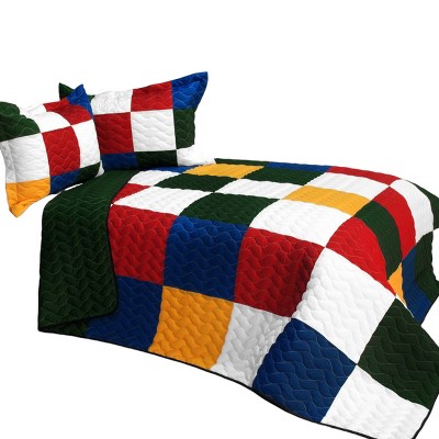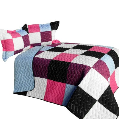 Slickblue Full/Queen 3PC Quilt Set, Checkered Design, Hand-Stitched, 100% TC, Patchwork, Multicolor/Pink/Blue