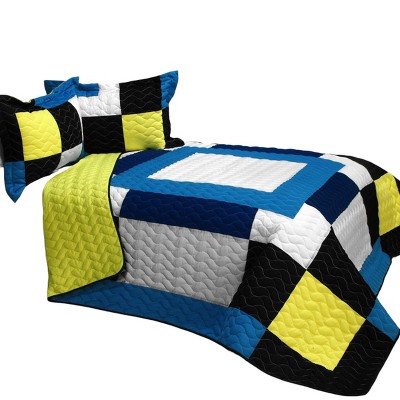 Elevate your bedroom with this 3-piece vermicelli-quilted patchwork quilt set, perfect for Full and Queen beds. The set includes a reversible quilt and two quilted shams, featuring a beautiful geometric patchwork design that adds a stylish and cozy touch. Crafted from soft TC fabric and detailed with intricate vermicelli stitching, this quilt set provides a rich texture and inviting atmosphere. The handmade construction may show slight variations, making each set unique. Pre-washed and pre-shrunk for a comfortable fit, this set is available in three vibrant color options: Blue, Yellow, and Green. It's easy to care for—simply machine wash cold and tumble dry on low. Whether updating your own room or gifting it to a loved one, this quilt set brings warmth, charm, and practicality to any space.