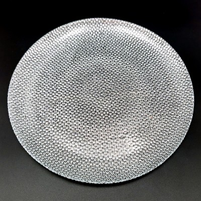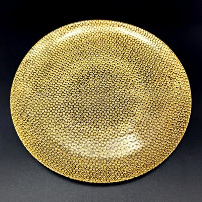 Elevate your dining experience with this exquisite 10.5" handcrafted glass dinner plate, available in clear, gold, or silver finishes. Whether you're hosting a lavish dinner party or enjoying a cozy meal at home, this plate adds a touch of sophistication that will impress your guests. The true color metal finish creates an opalescent look, enhancing the rich iridescence of the glass, while the distressed finish adds a striking contrast between the metal and glass. This versatile plate is perfect for everyday meals, special occasions, or as a stunning centerpiece for any table setting. Crafted with care, each piece features a petite continuous pebble pattern, ensuring that no two plates are exactly alike. It's an ideal choice for serving dinner, cake, desserts, or cheese, making it a must-have for any kitchen. Plus, with its food-safe, sealed, and oven-cured finish, you can enjoy peace of mind knowing it’s built for durability.