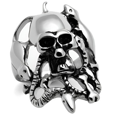 This men’s stainless steel ring features a polished silver finish and bold oblong shape, centered with a square black epoxy inlay. A faceted rectangular CZ crystal sits at the top left corner, creating contrast against the dark enamel. The ring’s modern design and clean lines offer a sharp, contemporary look suitable for daily wear or events. Crafted without plating, it maintains a smooth metallic finish and is available in sizes 8 to 13 for a secure fit.