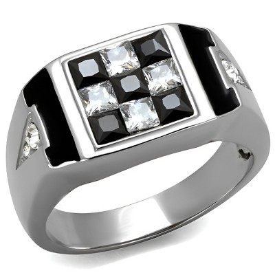 This men’s stainless steel ring features a bold octagonal black synthetic crystal at the center, highlighted by a surrounding halo of smaller stones. The clear crystal delivers eye-catching shine, contrasted by the black detailing for a sleek, modern look. Designed in polished stainless steel with no plating, the ring provides a smooth, mirror-like surface that adds to its visual appeal. With its silver and black color combo and refined shape, this ring is a standout piece in any men’s jewelry collection. Whether worn daily or for special events, it brings confident style with a comfortable fit. A popular pick for those shopping for men’s rings, bold accessories, or a meaningful Father’s Day idea. Available in a full range of sizes to suit your fit and style.