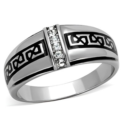 Refined with a bold edge, this men’s stainless steel ring features a two-tone IP gold finish and four square-cut clear synthetic crystals set at the center. The sleek gold-tone design adds a sharp contrast to the clear stones, creating a standout piece for both daily wear and special occasions. Weighing approximately 9.30 grams and available in size 8 to 13, this ring combines strength, polish, and modern style.