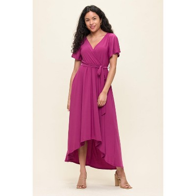A: The dress features a wrap front design that enhances your silhouette and adds sophistication.