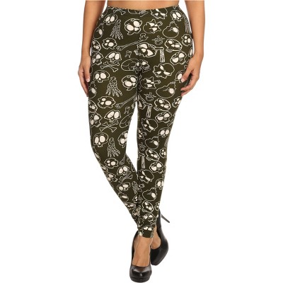 Slickblue Plus Size One Size Skulls & Bones Printed Leggings, Full Length, Banded High Waist, Stretch Fit, Black/Green