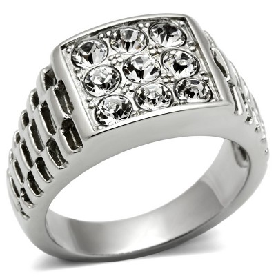 Make a statement with this polished stainless steel ring featuring clear synthetic crystals. Designed for men who want bold, eye-catching style, the pave crystal setting adds sparkle without being over the top. The polished stainless steel finish keeps it sleek and low-maintenance, while the no-plating design ensures it maintains its shine naturally. Perfect for casual, formal, or night-out looks, this ring works alone or stacked with other accessories. Comfortable and solid at approximately 10.4 grams, it’s available in sizes 8 to 13 to suit a range of fits.