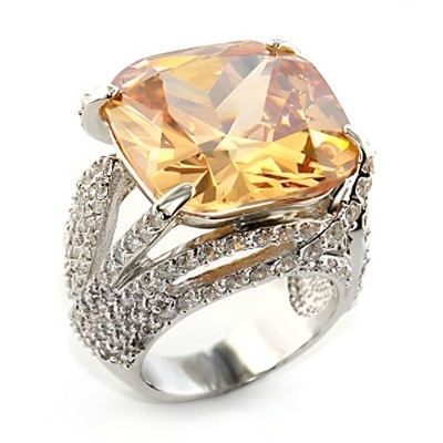 This Rhodium Brass Ring with Champagne CZ stones is a stunning choice for special occasions. The round-cut champagne cubic zirconia, set in a pave setting, creates an elegant and sparkling effect. Crafted from brass and plated with a rhodium finish, this ring offers both style and sturdiness. Available in sizes 5-10, it provides a comfortable fit for a wide range of wearers. Perfect for engagements, weddings, or any event where you want to shine, this piece brings sophistication and charm to your look.