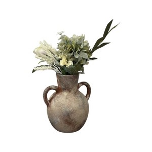Bring farmhouse charm and vintage character to your home with this Rustic Aged Terracotta Vase featuring a double-handle design. Crafted from ceramic with a weathered brown finish, this decorative jar adds antique-inspired texture to any tabletop, shelf, mantel, or entryway display. The double handles add both visual interest and functional grip, making it easy to move or style with dried flowers, faux greenery, or seasonal stems. Its distressed, earthy finish blends seamlessly with farmhouse, vintage, or shabby chic decor, while its versatile size works as a standalone accent or part of a layered arrangement.