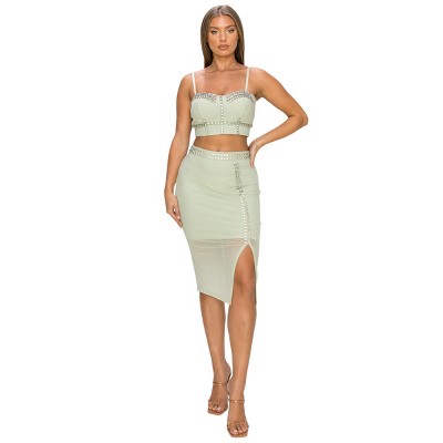 • 2-piece matching outfit: halter crop top and ruched mini skirt