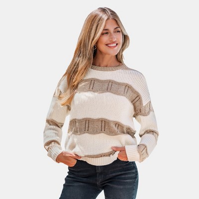 Slickblue Striped Knit Sweater for Women, V-Neck, Ruffled Hem Detail, Casual & Trendy, Grey/Mustard, S-M/M-L - 1 of 4