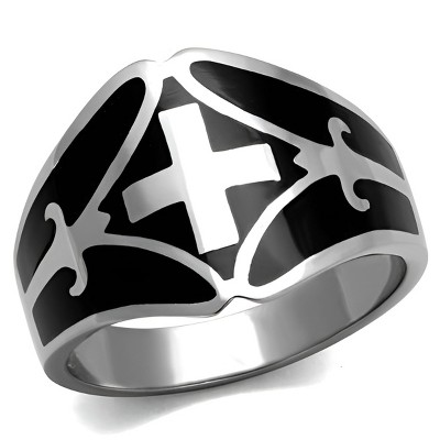 This men’s ring blends strong symbolism with bold design. Crafted from stainless steel, the wide band features a jet-black epoxy center that highlights a rose gold-toned cross at its core. Braided details and engraved patterns run along the band, creating texture and depth that elevate its look. The two-tone finish balances contrast and shine, making it a standout piece for everyday wear or special moments. Designed for men who prefer a powerful accessory with personal meaning, this ring is available in sizes 8 through 14 and offers a confident, polished edge to any outfit.