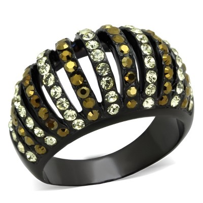 Women’s polished black stainless steel ring showcases a mosaic pattern of varying shapes, accented with clear synthetic crystals arranged in a swirling pave design. The epoxy finish adds durability and a smooth surface that enhances the sparkle of each stone. Designed for versatility, this ring pairs well with casual or formal outfits and is available in sizes 5 through 10. Lightweight yet eye-catching, it’s perfect worn alone or combined with other rings for a layered look.