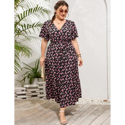 Slickblue Women's Plus Size Botanical Print Front Tie Dress, Stylish Design, Black, Size 1XL-3XL