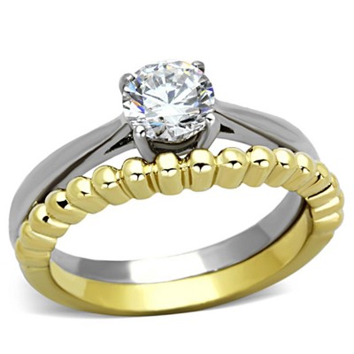 This women's ring set features a two-tone gold and silver design, crafted with stainless steel and finished with ion plating for a smooth, glossy look. The crown design is highlighted by a 3.5 mm round clear synthetic crystal at the center, adding a delicate and regal touch to the piece. Weighing approximately 2.67 grams, the rings are lightweight and comfortable for daily wear. Available in sizes 5 to 10, this set is perfect for weddings or any special occasion, offering a modern twist on a classic design. It’s a great gift for brides, engagements, or milestone moments.