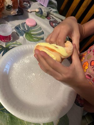 [This review was collected as part of a promotion.] Fun concept. Looks very realistic. Fun short activity. Sweet smell to slime. Toppings are sticky slime while “doughnut” is soft foam slime. After decorating can squish all together to have ball of foam slime to continue play.