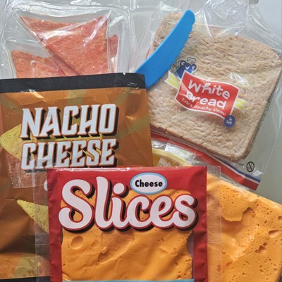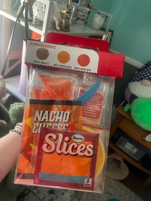 [This review was collected as part of a promotion.] My daughter squeezed and squealed when she saw this. The packaging to me is the best part it looks like a whole little meal set for a kid. The texture variations was her favorite part. The chips kind of feel hard like a tortilla chip, the cheese was soft and gooey, the bread was thick like real bread using more of a foam slime. Great colors and great, packaging. Not too messy cause it's more of a foam, not a runny slime.