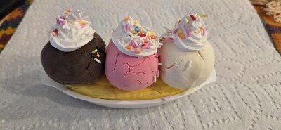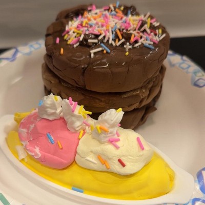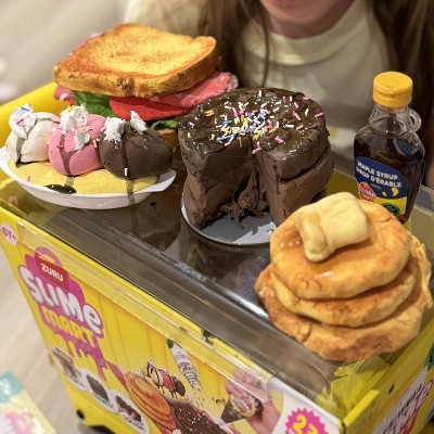 Making all of the food products was fun but there was a ton of leftover stuff like the syrup, butter, tomatoes, and the random piece of lettuce. It feels more like clay than slime, the instructions were a little vague, and after you squish the slime it's just not good anymore. The icing also didn't work that well. Overall it was fun to create the food but afterwards you can't really play with it. It's just a one time use. Mat is provided for easy clean up. It also has a recipe book you can follow to make different recipes like 3 layered cake, sandwich and banana split