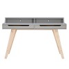 Designed for getting down to business, the wide top surface on this desk provides plenty of workspace. The attached hutch helps organize tasks and the dual drawers hold lots of supplies. Three desktop color choices beautifully reflect today’s home fashion trends as does their contrast with a natural finish on the undercarriage and legs, which flare to further enhance the look. The desks complement a wide variety of room styles from midcentury modern to country.