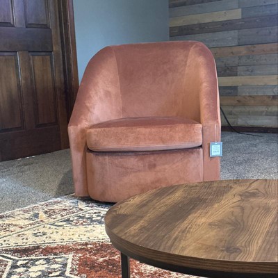 Fill your living space or office with luxe style with this Velvet Slope Arm Swivel Chair from Threshold™ designed with Studio McGee. Supported on a wooden frame and designed in a classic barrel shape, this swivel chair features a six-inch thick seat cushion to let you comfortably relax. Plus, it has a round pedestal base that allows the chair to rotate in all directions, making it easy to access everything you're working with. Wrapped in plush velvet upholstery in a solid hue with seam detailing, it's sure to elevate your living room or home office.